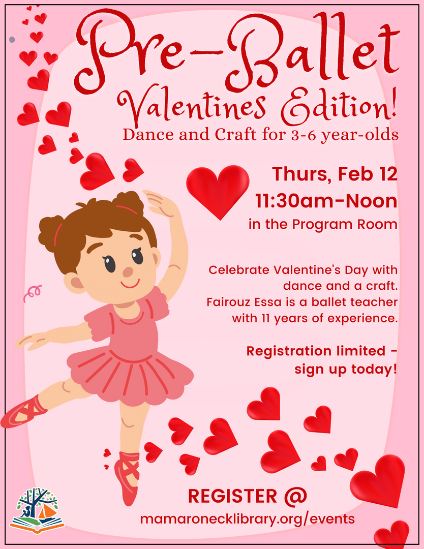 HomeEventsValentine Ballet Class Valentine Ballet Class Thursday, February 12, 2026 11:30 AM - 12:00 PM 11:30 AM - 12:00 PM See all dates and Times Mamaroneck Public Library District Parking Deals Get a Ride LYFT UBER Add to Calendar 02/12/2026 11:30 AM 02/12/2026 12:00 PM America/Atikokan Valentine Ballet Class Mamaroneck Public Library mamaronecklibrary.org/events Please see flyer for detailsEvent LinksInquiries: https://go.evvnt.com/3464080-0 Details & Tickets: https://www.upcomingevents.com/bronx/events/mamaroneck-public-library-district/valentine-ballet-class-596670?ref=uceaddevent Mamaroneck Public Library District, 136 Prospect Avenue, Mamaroneck, NY, 10543 Set Reminder Categories Good For Families, Kid-Friendly, Kids & Family, Neighborhood Mamaroneck Public Library mamaronecklibrary.org/events Please see flyer for detailsEvent LinksInquiries: https://go.evvnt.com/3464080-0