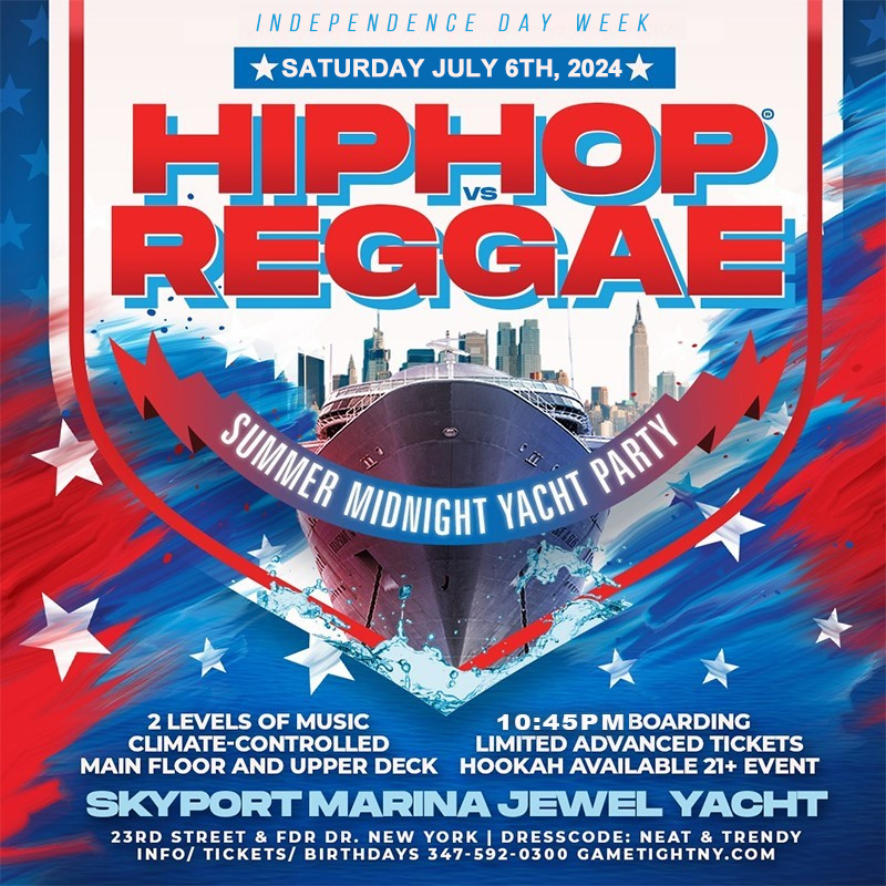 Sat July 6th, 2024 -The Official NYC Saturday Night July 4th Week Party Cruise Jewel Yacht Hip Hop vs Reggae® Skyport Marina 2024 (347) 592-0300