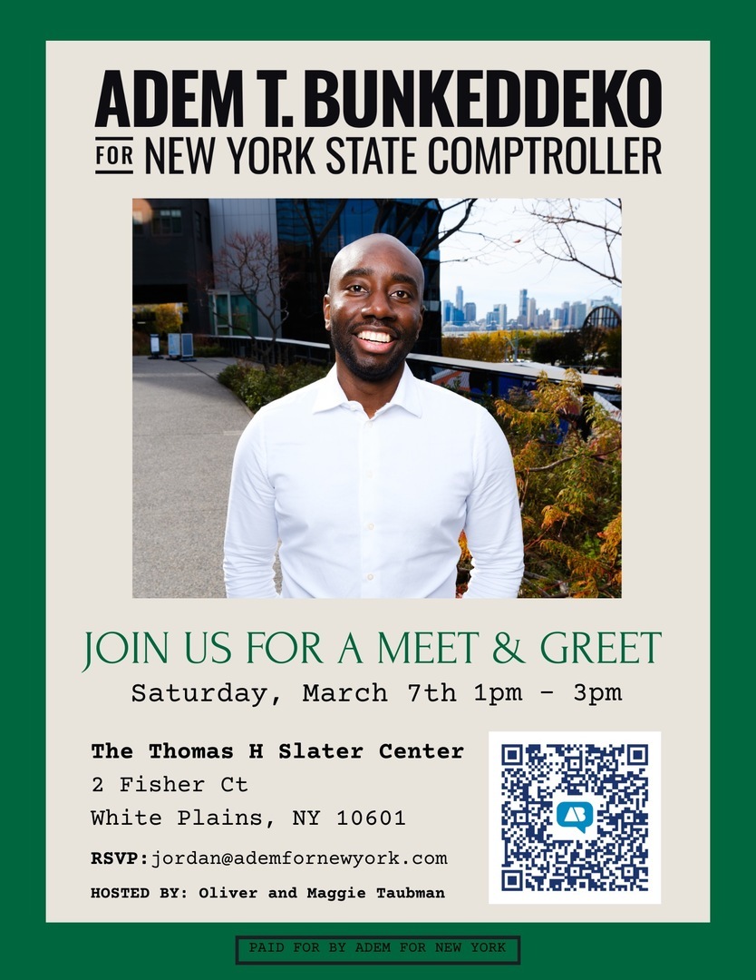 Join us in White Plains on Saturday, March 7, from 1 - 3 pm for a Meet and Greet with Adem Bunkeddeko, Democrat running for New York State Comptroller. The event will be at: The Thomas H Slater Center, 2 Fisher Ct., White Plains, NY 10601.