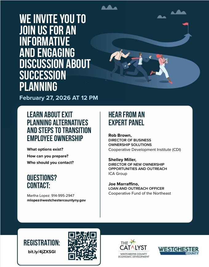 HomeEventsSuccession Planning Webinar Succession Planning Webinar Friday, February 27, 2026 12:00 PM - 1:00 PM 12:00 PM - 1:00 PM See all dates and Times White Plains Parking Deals Get a Ride LYFT UBER Add to Calendar 02/27/2026 12:00 PM 02/27/2026 01:00 PM America/Atikokan Succession Planning Webinar Learn about exit planning alternatives and steps to transition employee ownership What options exist? How can you prepare? Who should you contact? Details & Tickets: https://www.upcomingevents.com/bronx/events/white-plains/succession-planning-webinar-603515?ref=uceaddevent White Plains, White Plains, White Plains, NY, 10601 Set Reminder Categories Business & Networking, Business-Related, Sales & Retail Neighborhoods Armonk (North Castle)Beech Hill (Yonkers)Crestwood (Yonkers)Greenville (Scarsdale) Learn about exit planning alternatives and steps to transition employee ownership What options exist? How can you prepare? Who should you contact?