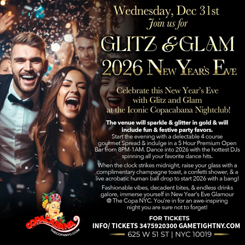 For more information/ tickets/ birthdays at Gatsby New Year’s Eve 2026 Party at The Legendary Copa NYC call/ text 3475920300 or log onto Gametightny.com