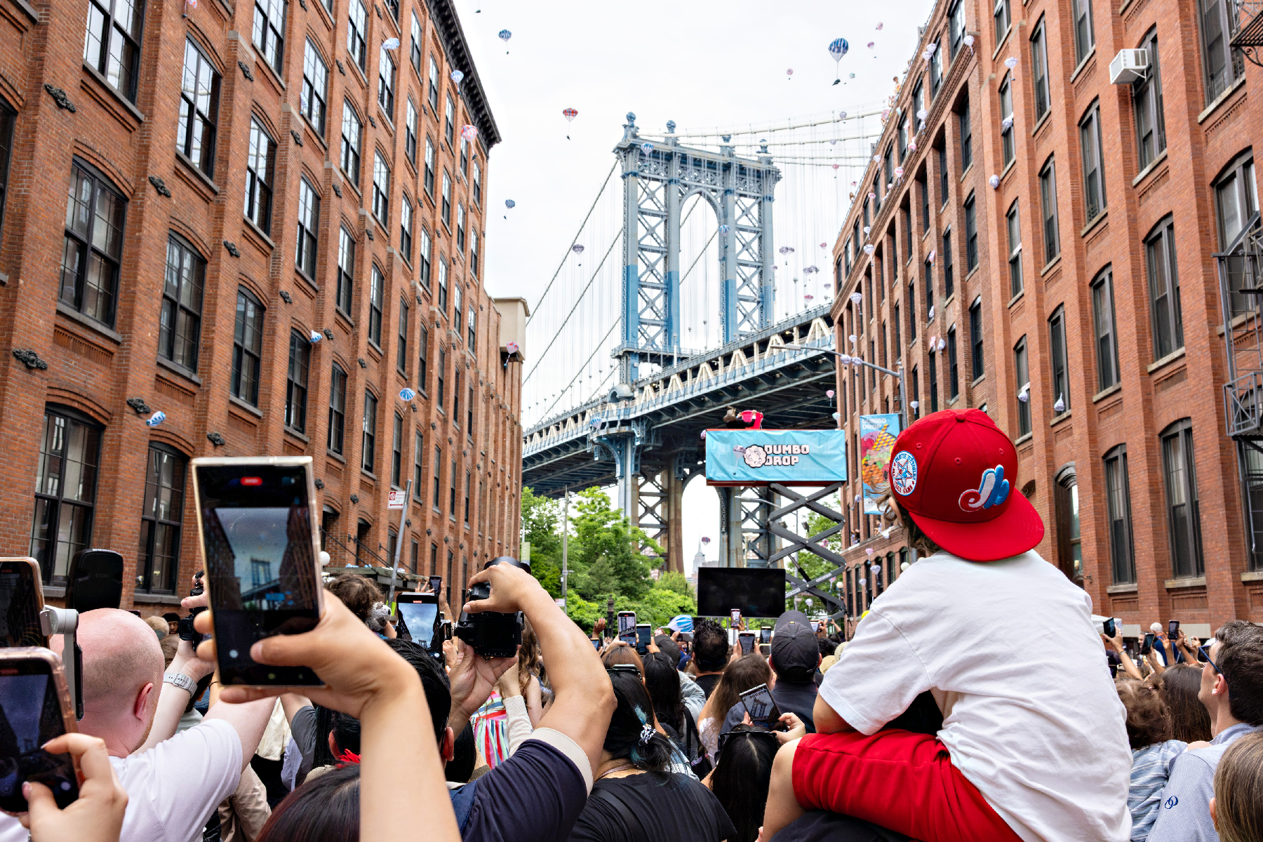 Brooklyn’s flying elephant fundraising spectacle, the annual Dumbo Drop, is back on Friday, May 29, 2026 with two drops at 5pm and 7pm of thousands of parachuting toy elephants from the rooftops surrounding Washington Street, the borough’s most iconic block.