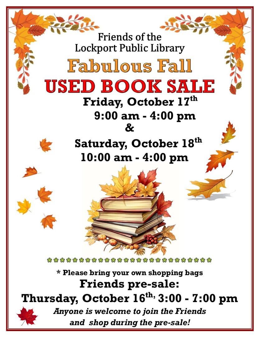 A pre-sale for members of the Friends of the Lockport Public Library will take place on Thursday, October 16th from 3 p.m. until 7 p.m. Anyone is welcome to join the Friends and shop during the pre-sale. Individual memberships are only $5.00!
