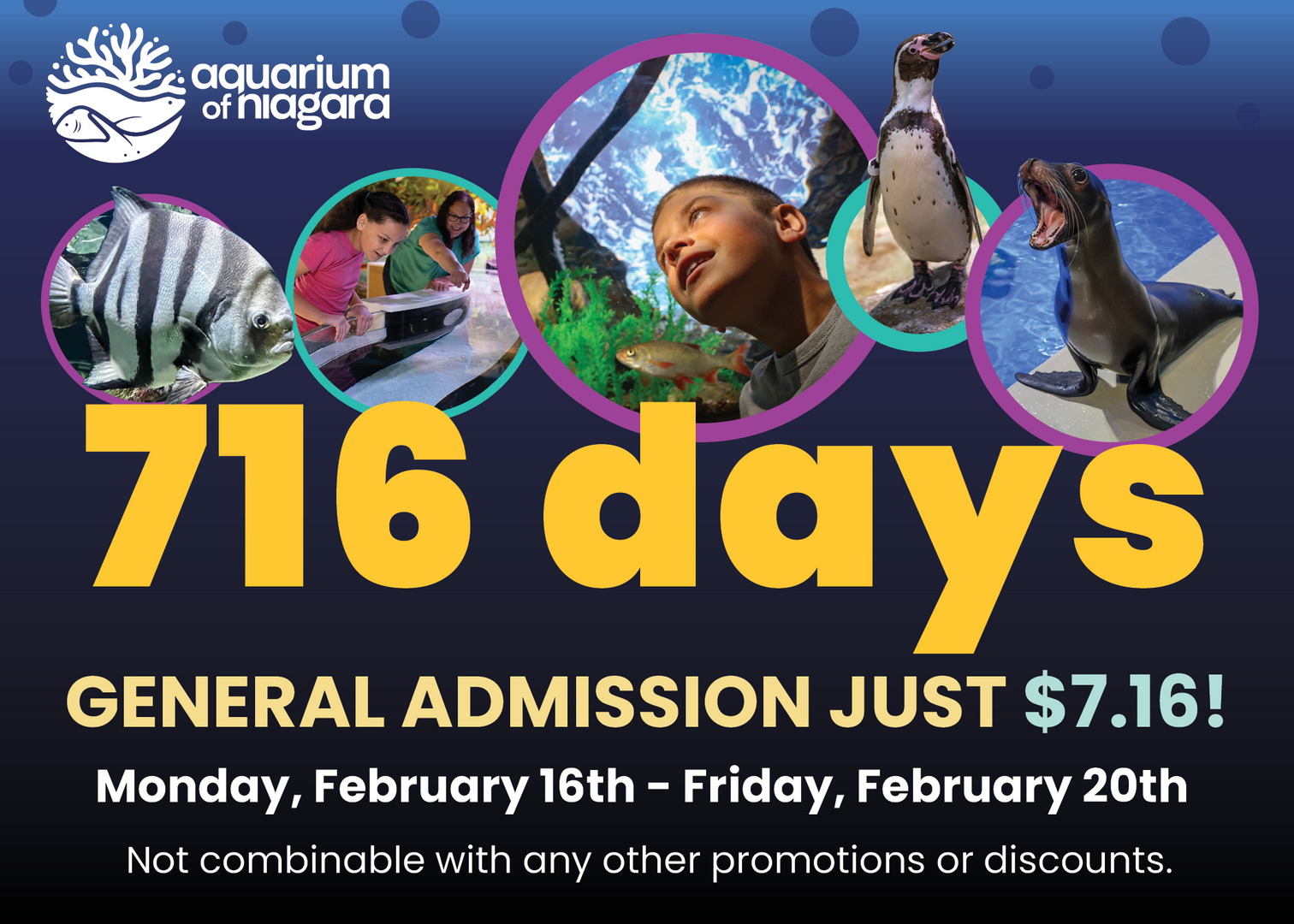 We're celebrating WNY during February break with another 716 Days! From Monday, February 16 through Friday, February 20, all admission to the Aquarium of Niagara is just $7.16! Beat the winter blues and enjoy our lowest admission prices of the year.