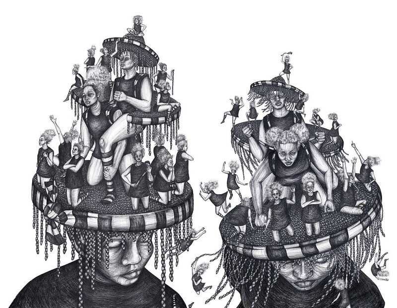 Modder’s process combines traditional and digital techniques. She begins with intricate pen drawings, often rendered with an attention that reflects personal rituals of self-care, such as detangling curls. These hand-drawn elements are scanned and reassembled into striking digital collages that borrow from the visual language of comics. In each work, hair is a central motif—a symbol of beauty, rebellion, and connection. It becomes a way to both comfort and confront, challenging imposed standards while celebrating cultural resilience.