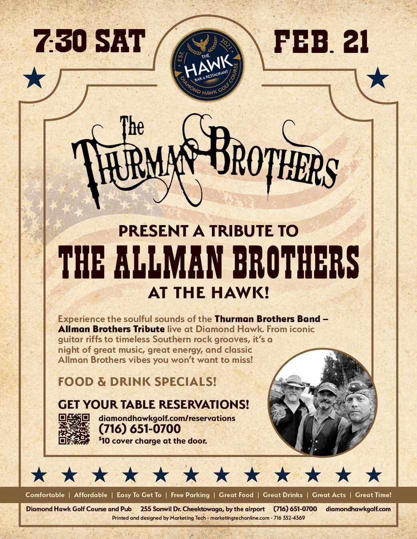 Experience the soulful sounds of the Thurman Brothers Band – Allman Brothers Tribute live at Diamond Hawk. From iconic guitar riffs to timeless Southern rock grooves, it’s a night of great music, great energy, and classic Allman Brothers vibes you won’t want to miss