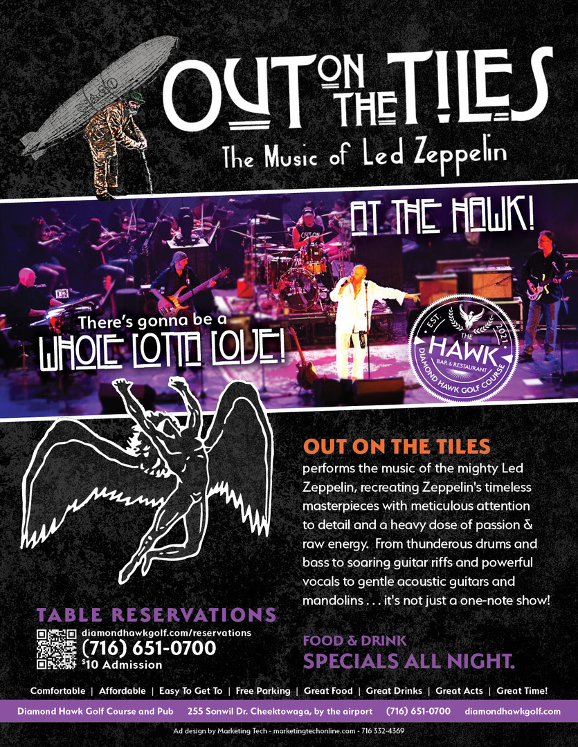 OUT ON THE TILES performs the music of the mighty Led Zeppelin, recreating Zeppelin's timeless masterpieces with meticulous attention to detail and a heavy dose of passion & raw energy. From thunderous drums and bass to soaring guitar riffs and powerful vocals to gentle acoustic guitars and mandolins . . . it's not just a one-note show.