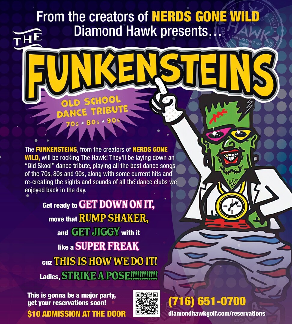 The FUNKENSTEINS, from the creators of NERDS GONE WILD, will be rocking The Hawk! They’ll be laying down an “Old Skool” dance tribute, playing all the best dance songs of the 70s 80s and 90s, along with some current hits and re-creating the sights and sounds of all the dance clubs we enjoyed back in the day.