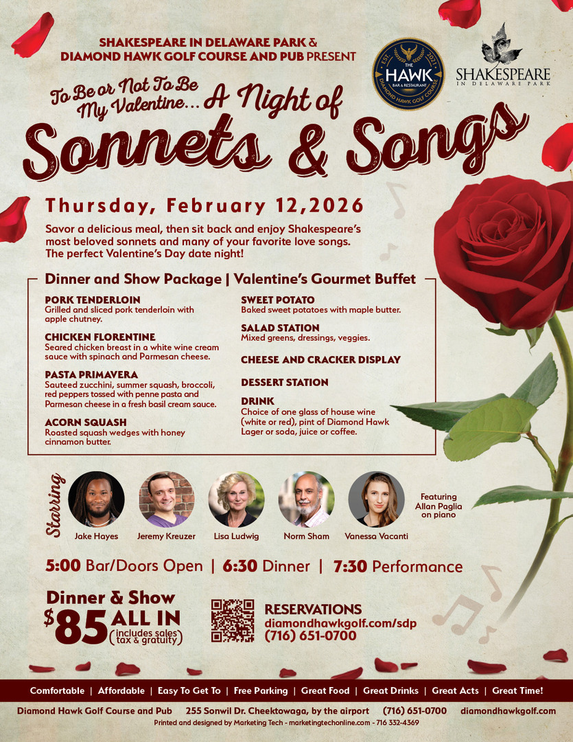 Savor a delicious meal, then sit back and enjoy Shakespeare’s most beloved sonnets and many of your favorite songs. The perfect Valentine’s Date Night!