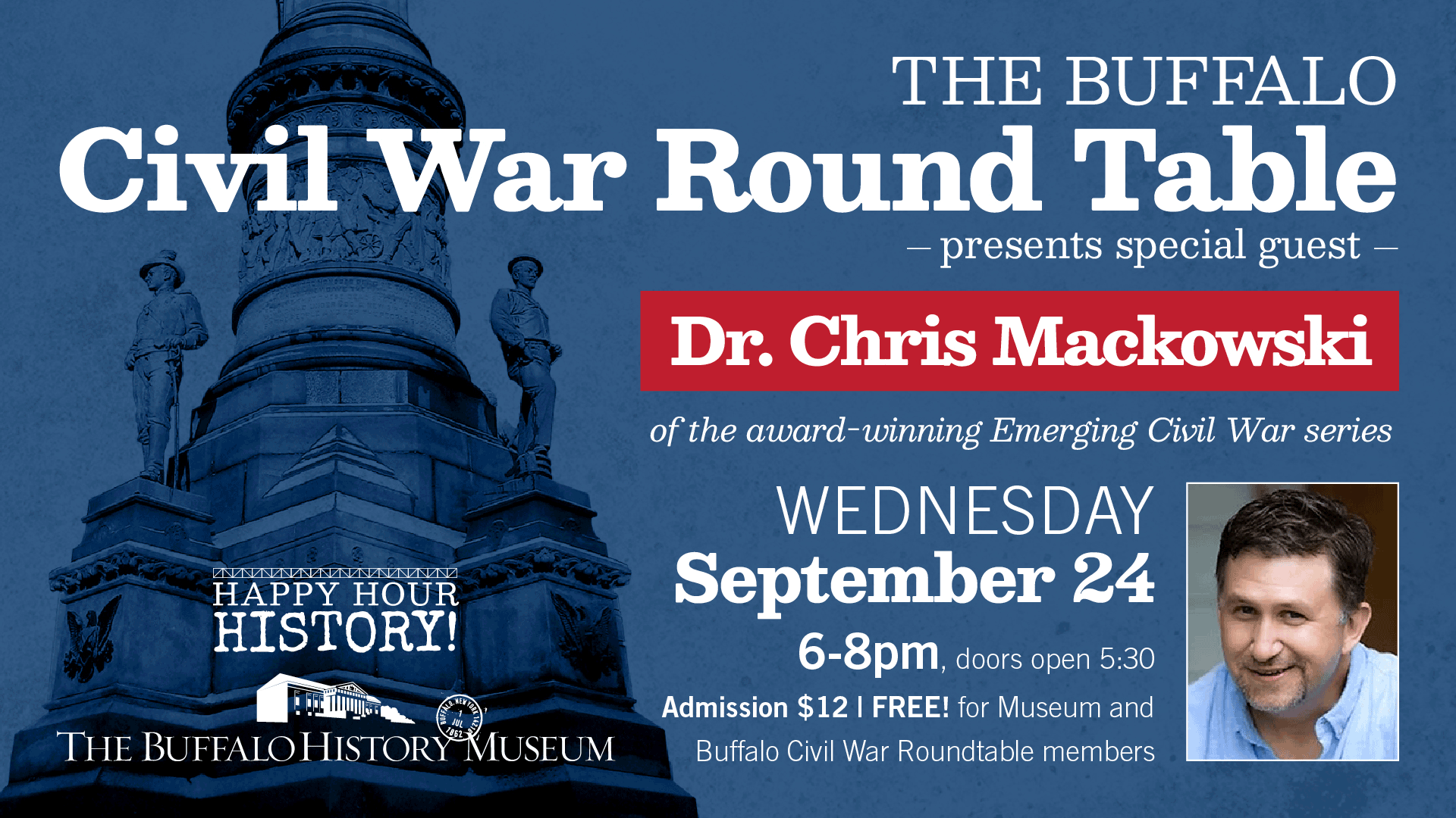 The Buffalo Civil War Round Table is pleased to be presenting Dr. Chris Mackowski at the Buffalo History Museum, on Wednesday, September 24 at 6:00 pm. Dr. Mackowski is author or more than a dozen books and a professor at St. Bonaventure University. He is cofounder of the blog Emerging Civil War and historian-in-residence at the historic Stevenson Ridge property on the Spotsylvania battlefield.