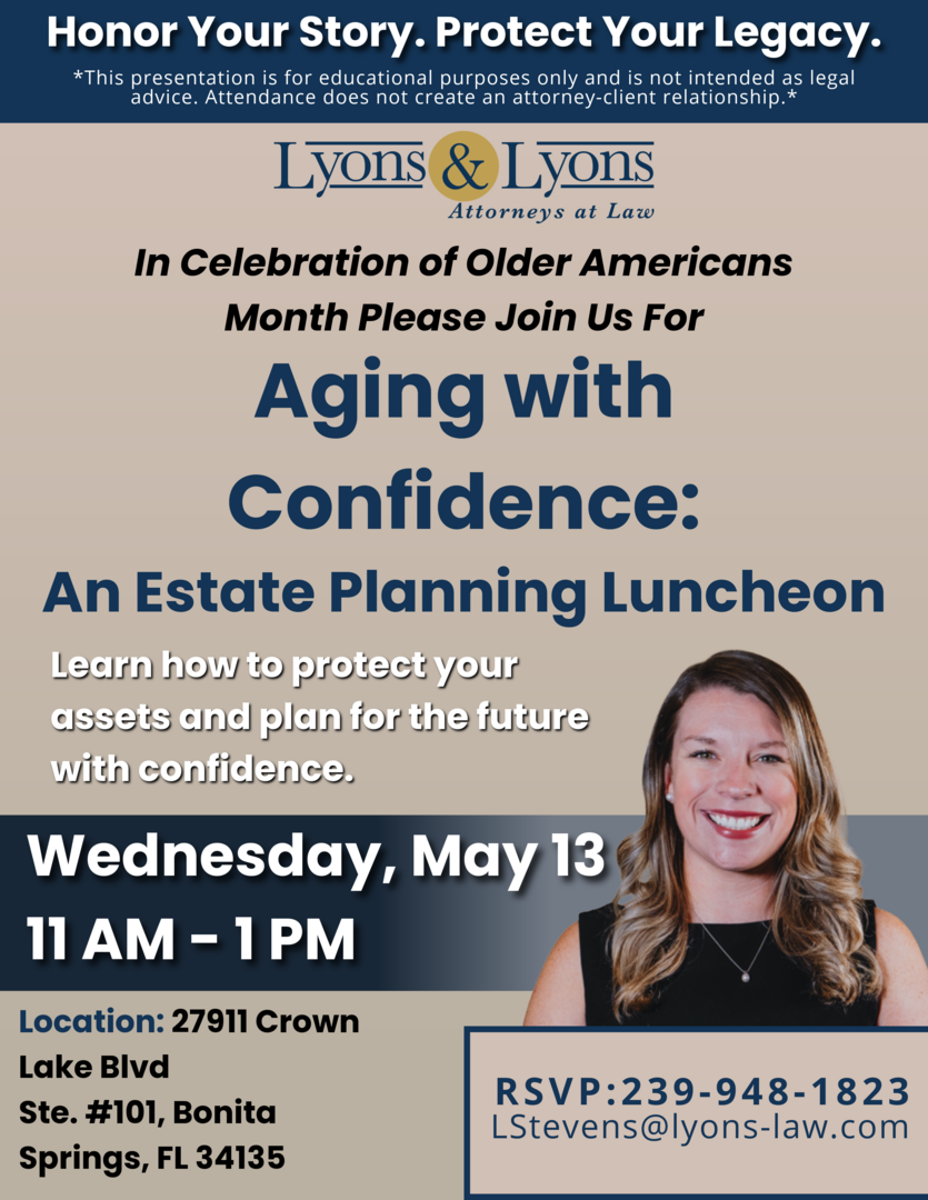In recognition of Older Americans Month, Lyons & Lyons Attorneys at Law will host a complimentary educational luncheon titled “Aging with Confidence: An Estate Planning Luncheon” on Wednesday, May 13, from 11 a.m.-1 p.m. at the firm’s Bonita Springs office.
