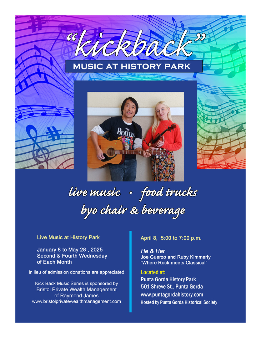 Bring your own chair, your favorite beverage, and snacks if you like. The Hot Dog Lady will be on site. In lieu of admission, your donations are greatly appreciated to help us maintain our historic buildings. Hosted by the Bristol Private Wealth Management of Raymond James www.bristolprivatewealthmanagement.com and the Punta Gorda Historical Society www.puntagordahistory.com