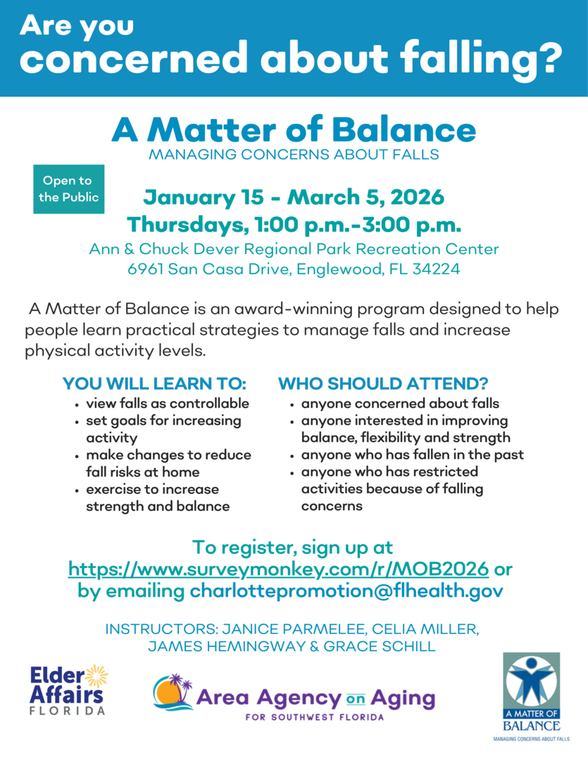 Join the Florida Department of Health in Charlotte County (DOH-Charlotte) and Area Agency on Aging for Southwest Florida in A Matter of Balance, an award-winning program designed to help seniors learn practical strategies to manage falls and increase physical activity levels.