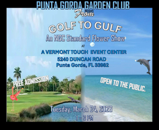 HomeEventsPunta Gorda Garden Club NGC Gulf to Golf Flower Show March 24, 2026 Free Admission 1-3pm Punta Gorda Garden Club NGC Gulf to Golf Flower Show March 24, 2026 Free Admission 1-3pm Tuesday, March 24, 2026 1:00 PM - 3:00 PM 1:00 PM - 3:00 PM See all dates and Times A Vermont Touch Florist & Events Parking Deals Get a Ride LYFT UBER Add to Calendar 03/24/2026 01:00 PM 03/24/2026 03:00 PM America/Atikokan Punta Gorda Garden Club NGC Gulf to Golf Flower Show March 24, 2026 Free Admission 1-3pm Floral Design's and Horticultural Displays Free Admission 19m to 3pm Details & Tickets: https://www.upcomingevents.com/cape-coral/events/a-vermont-touch-florist-events/punta-gorda-garden-club-ngc-gulf-to-golf-flower-show-march-24-2026-free-admission-1-3pm-600572?ref=uceaddevent A Vermont Touch Florist & Events, 5240 Duncan Road, Punta Gorda, FL, 33982 Set Reminder Categories Environmental, Gardening / Horticultural, Outdoor Event Floral Design's and Horticultural Displays Free Admission 19m to 3pm