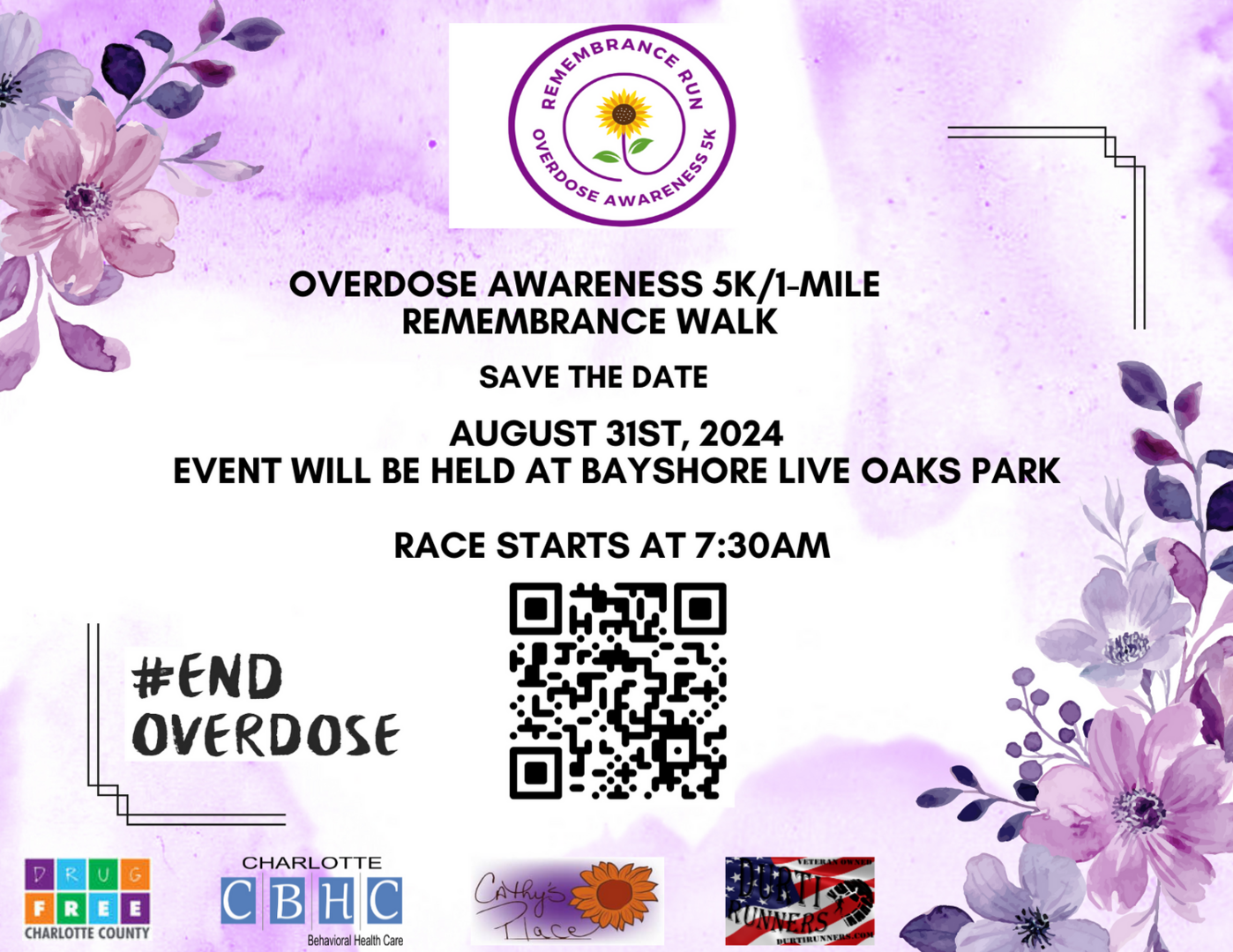 Collaborating with Drug Free Charlotte County, Charlotte Behavioral Health Center, Cathy's Place of Charlotte County, and Durti Runners, we have organized this significant event to raise awareness about the overdose epidemic and honor those affected by overdose. The event will feature a range of activities, including raffles, a live DJ, and the distribution of free Narcan to all finishers. Additionally, participants are invited to submit photos of their loved ones on our website at https://runsignup.com/ODAY5K for a special tribute during the event. It is an opportunity to pay homage to those we have lost and show support for those still struggling.
