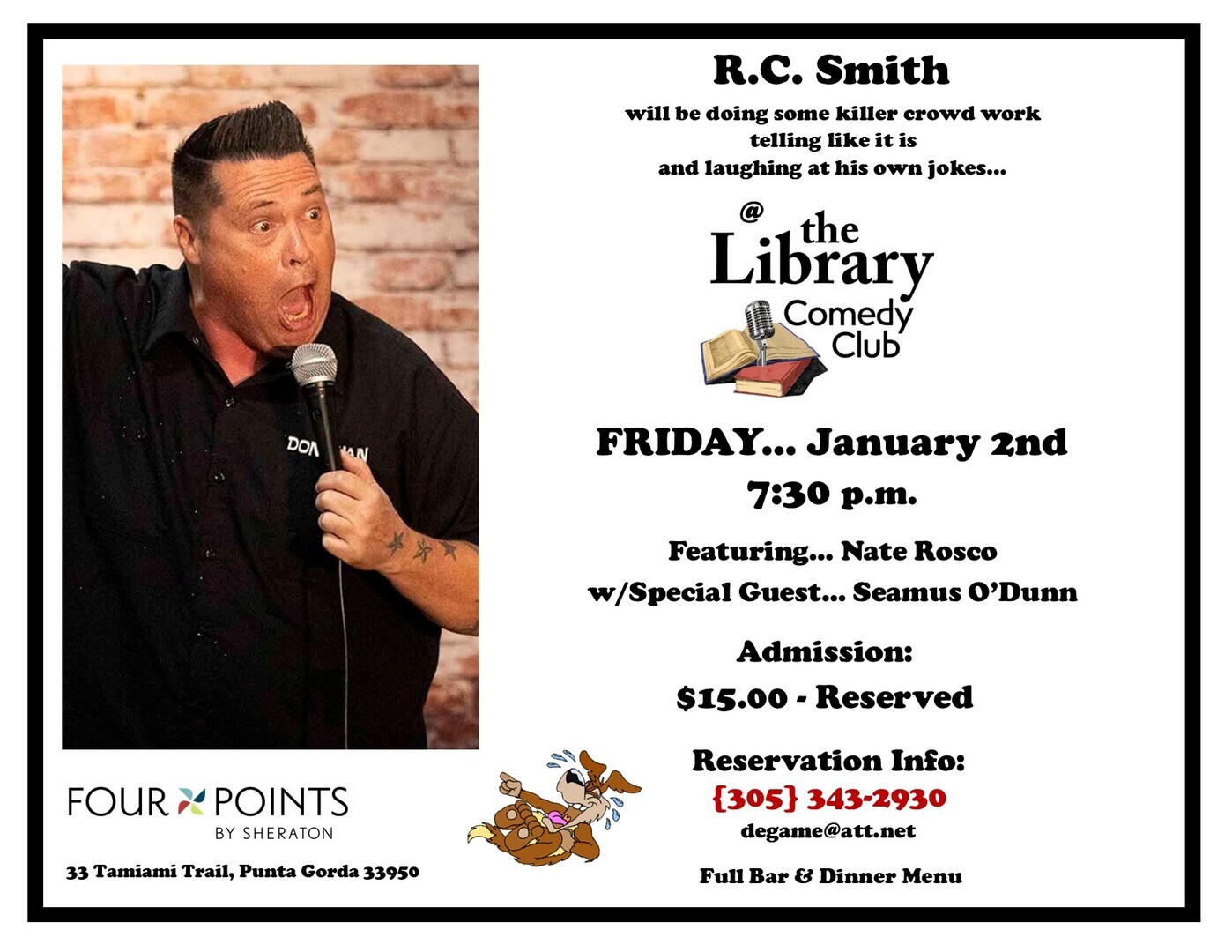 There's just no better way to begin another new year than to bring R.C. Smith back to the Library Comedy Club. RC has the reputation as being one of the greatest “crowd work” guys in the television & comedy show business. Known for his flawless improvisational style... RC was an iconic “warm-up comic” for some of the best known morning shows in the country. R.C. pulls out all the stops, and with his boundless energy & rapid fire delivery... every show is truly a one-of-a-kind experience. Featuring Nate Rosco along with Special Guest Seamus O’Dunn. Friday, January 2nd. Admission $15. Reservation Info: 305 343-2930 / [email protected]