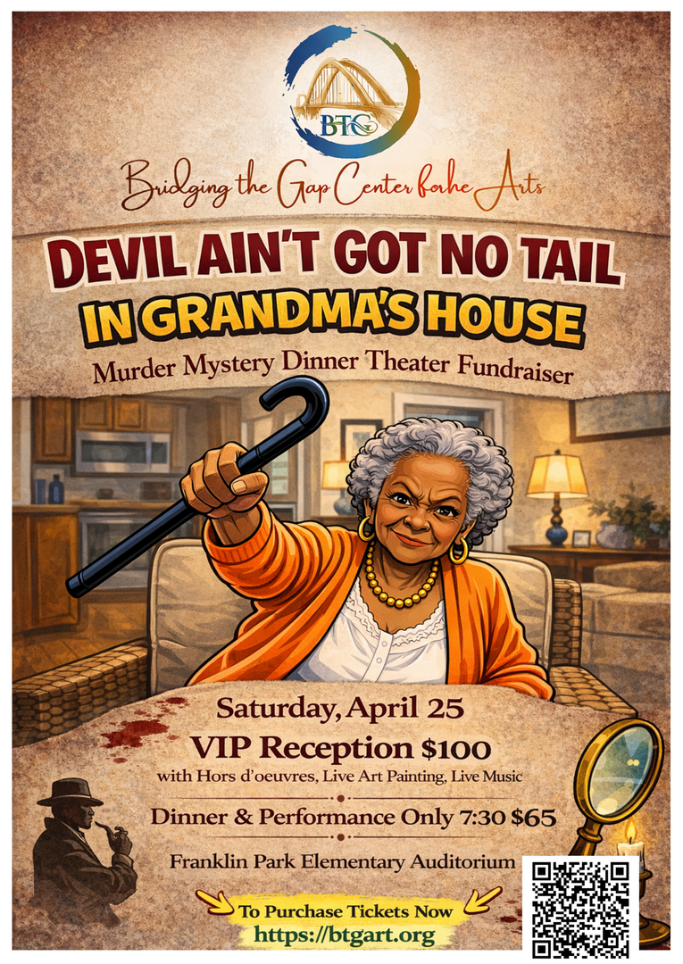 This event is an interactive Murder Mystery Dinner Theater titled “The Devil Ain’t Got No Tail in Grandma’s House.” Proceeds from the evening will help fund programs that bring acting, visual arts, and creative workshops directly into local schools, community centers, and senior communities.