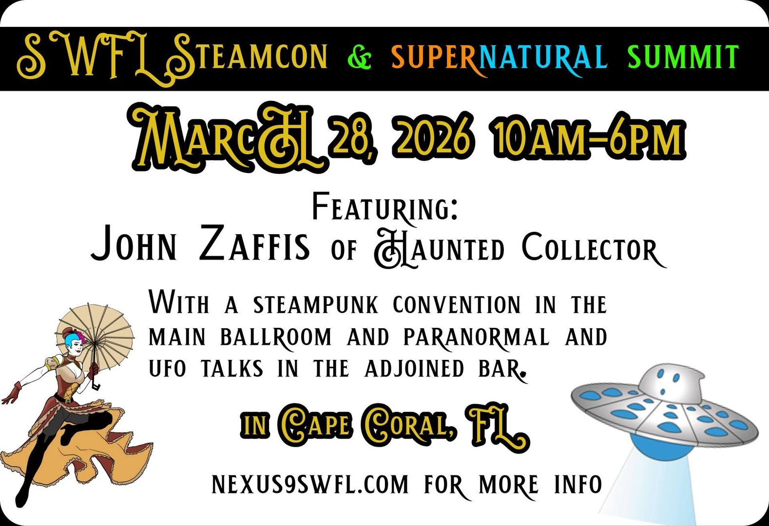 Step into a World of the extraordinary & fantastical with the mysteries of present. Celebrate the creativity of Steampunk and the intrigue of the paranormal. Firstly, enter the portal to a Victorian-era future, explore a day filled with creative activities including: Splendid Teapot Racing, Parasol Dueling, Tea Dueling, Hamster Wars, Costume Contests, and more! For those drawn to the unexplained, discover the mystery of paranormal activities, UFOs, aliens, and metaphysics, with Featured Guest, John Zaffis, the renowned "Godfather of the Paranormal" and star of the TV show Haunted Collector and Guests Speakers: Christopher Balzano. Phyllis Csaszar, R.M. Rose, Robert Robinson (Please no videography is allowed and photography is limited in this portion of the event). The event is indoors, so we look forward to seeing you, rain or shine.