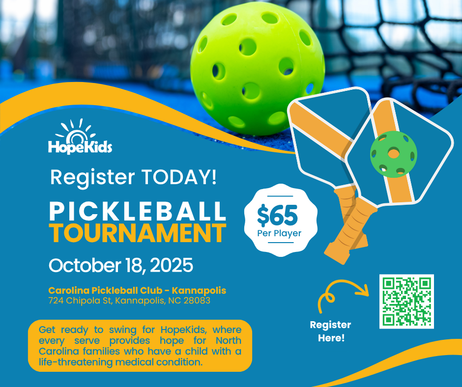 Join us at Carolina Pickleball Club in Kannapolis for an unforgettable day of friendly competition, camaraderie and purpose. The funds raised from this tournament benefits HopeKids which provides ongoing events, activities and a powerful, unique support community for families who have a child with cancer or some other life-threatening medical condition. Don't miss this chance to make a difference!