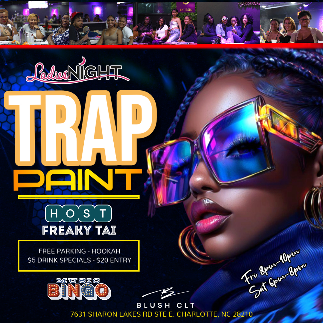 Season 9 of the Queen City Urban Art Showcase presents "Trap & Paint + Music Bingo" every weekend! Sip & Paint to hard hitting trap music, hiphop, reggae, and r&b. Located in the newest lounge in the South Charlotte area. Music by the best DJ's in town. Limited space available so get your tickets asap. Hosted by Freaky Tai the #1 showstopper in Charlotte! Food truck onsite, $5 drinks, and $25 hookahs round out this wonderful event!