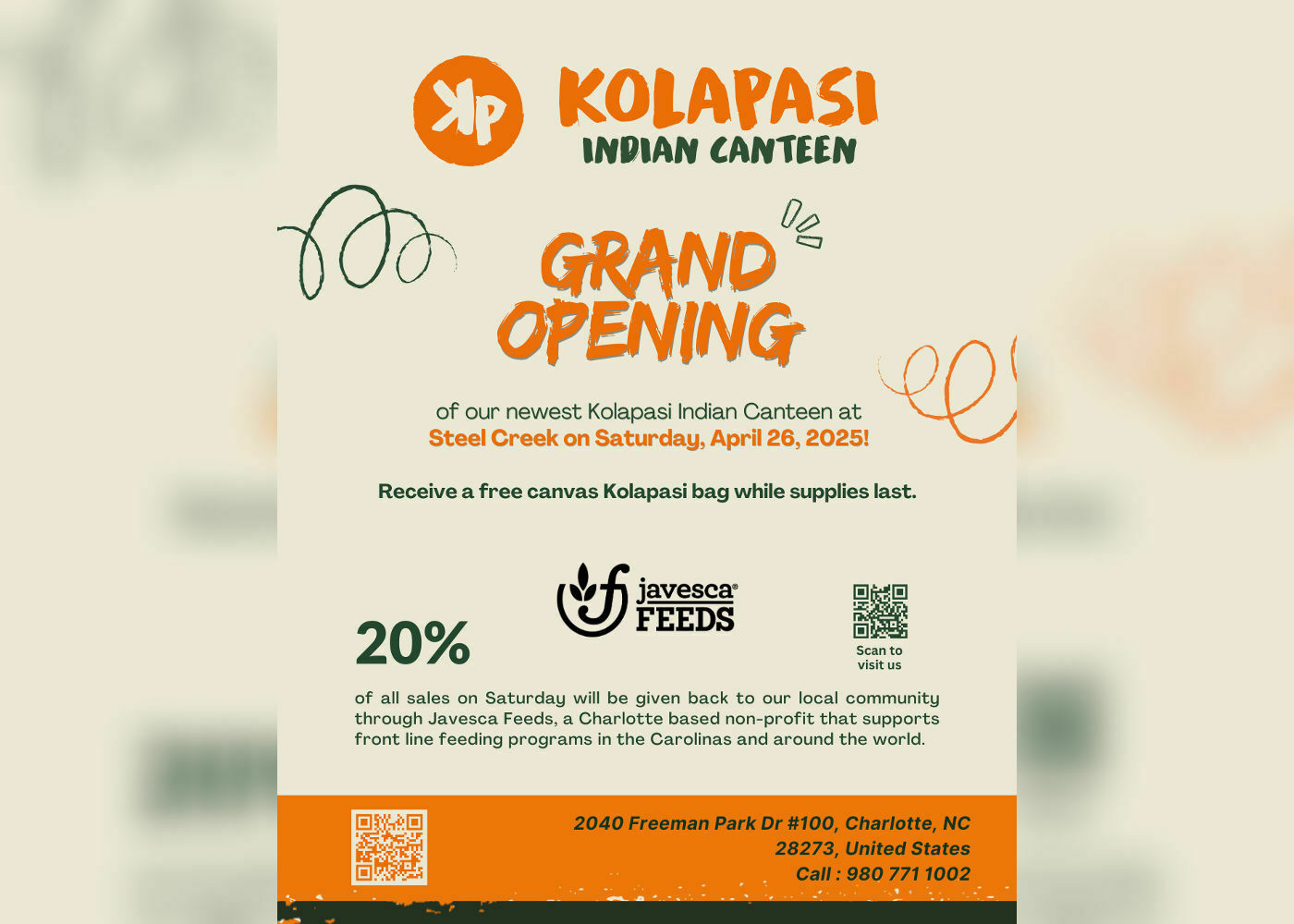 Kolapasi – dubbed the “Chipotle” of Indian food – is celebrating the Grand Opening of its second location in North America with its first store in Charlotte. This community celebration is an opportunity for all living in the Charlotte area to *See. Taste. Order.*, Kolapasi’s proprietary approach to menu selection, which encourages taste and cultural exploration through sampling, while ensuring that all guests get the spice level and flavor sensation of their preference. The community will enjoy limitless samples, handcrafted merchandise (while supplies last) and charitable contribution opportunities - 20 percent of proceeds will be donated to Charlotte-based nonprofit, Javesca Feeds, which supports frontline feeding programs locally and around the world.