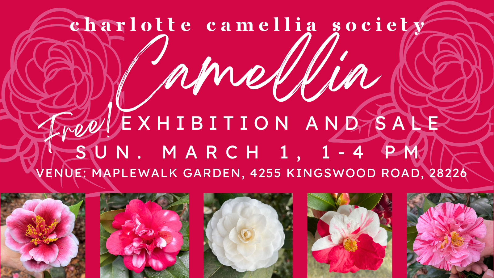 FREE! Join the Charlotte Camellia Society for its annual Camellia Exhibition and Sale on Sunday, March 1 from 1 to 4 PM at MapleWalk Garden. Unique camellias to buy and experts to answer questions about this classic Southern winter blooming shrub. You’ll be inspired as you explore over 140 varieties of camellias at MapleWalk Garden at 4255 Kingswood Road, Charlotte NC 28226. Rain or shine. Questions? Email [email protected]