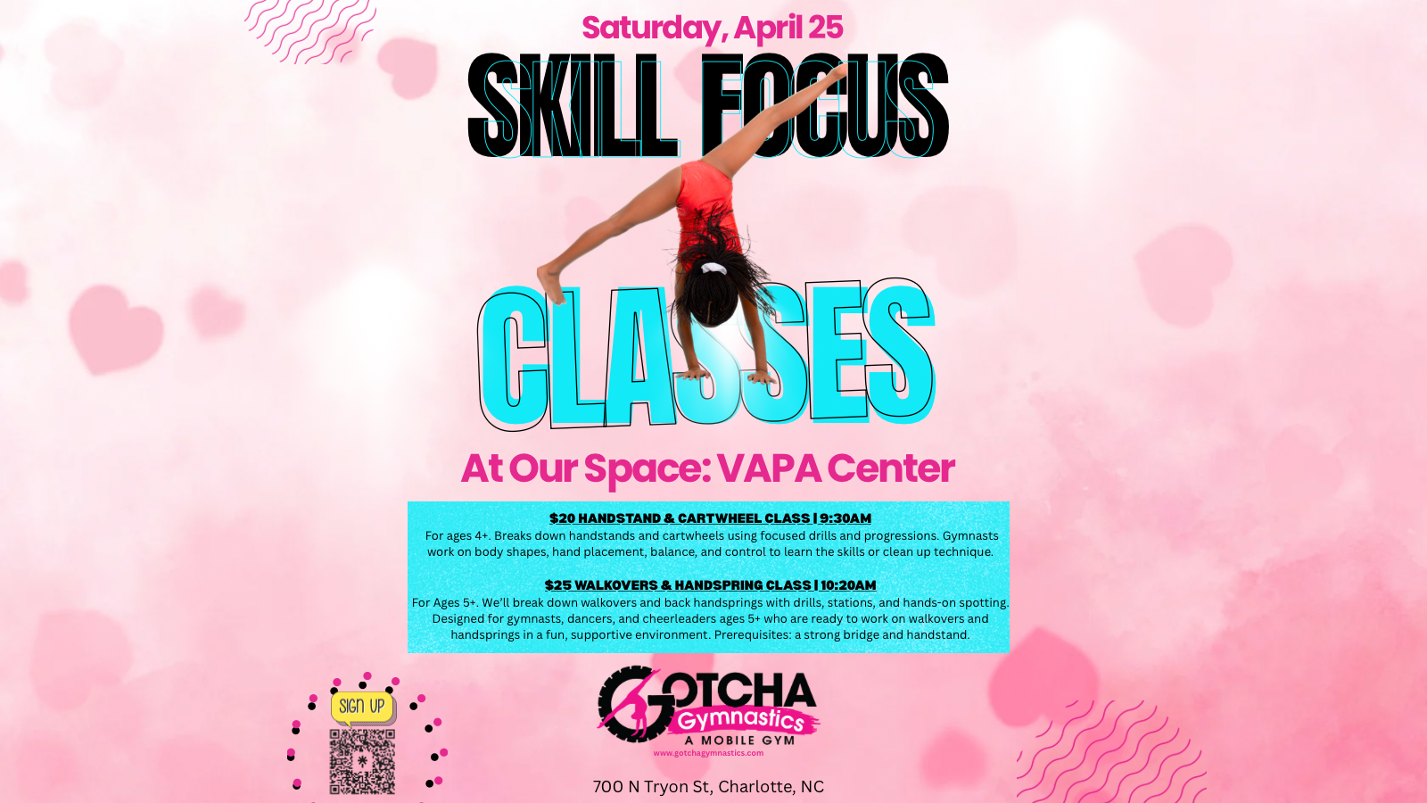 💥 Back Walkover & Handspring Clinic $25 (Ages 5+ – must have a strong bridge and handstand) This clinic focuses on powerful back walkovers and handspring progressions, including technique breakdown and strength-building stations.