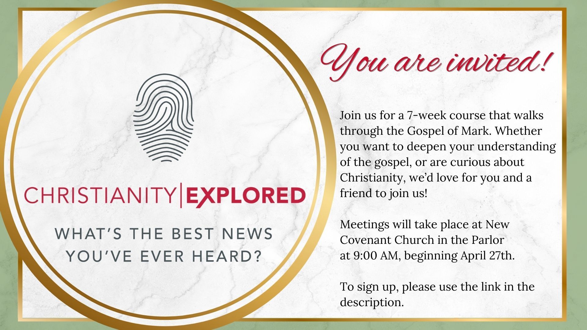 Christianity Explored at New Covenant Church in Naperville. For anyone looking to explore the Christian faith, who Jesus is, and why he matters. All materials will be provided. Come for coffee and great conversation! Sundays at 9 AM, 1 Bunting Lane in Naperville.