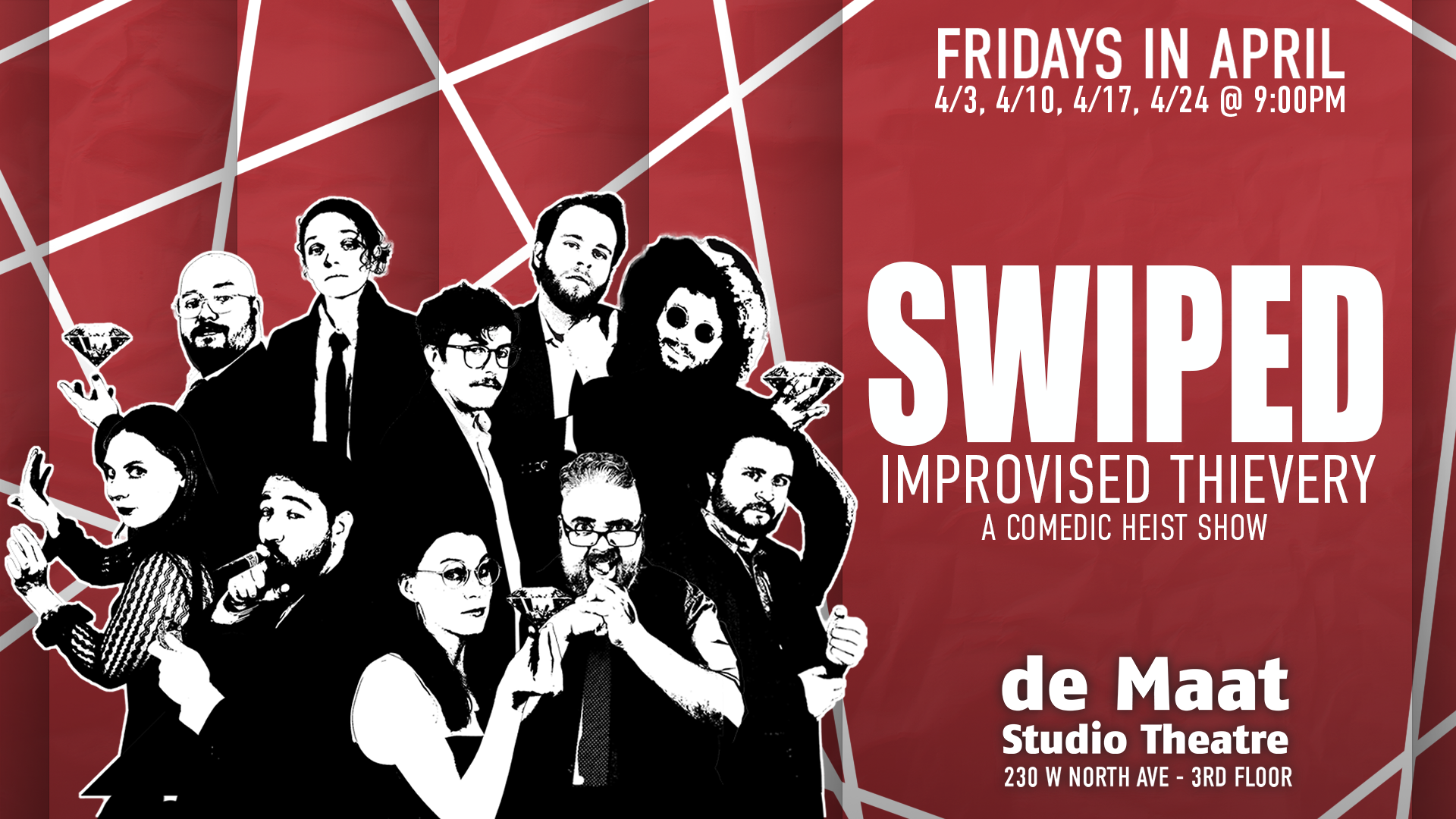 What is SWIPED Improvised Thievery? It's an improvised heist show where we steal a priceless object based on a suggestion the audience gives us. From there we'll take you through the thrilling highs and lows of the heist genre with a comedic bent! There will be a colorful crew of criminals, daring obstacles to overcome, mustache twirling villains, and of course - we pull it all off seamlessly with no complications what so ever.
