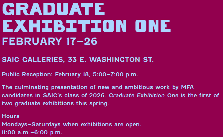 The School of the Art Institute of Chicago (SAIC) is presenting Graduate Exhibition One, the first of the two annual graduate exhibitions hosted in the spring. Running from February 17-26, this exhibition is a culmination of new and ambitious work by SAIC’s class of 2026 MFA candidates.