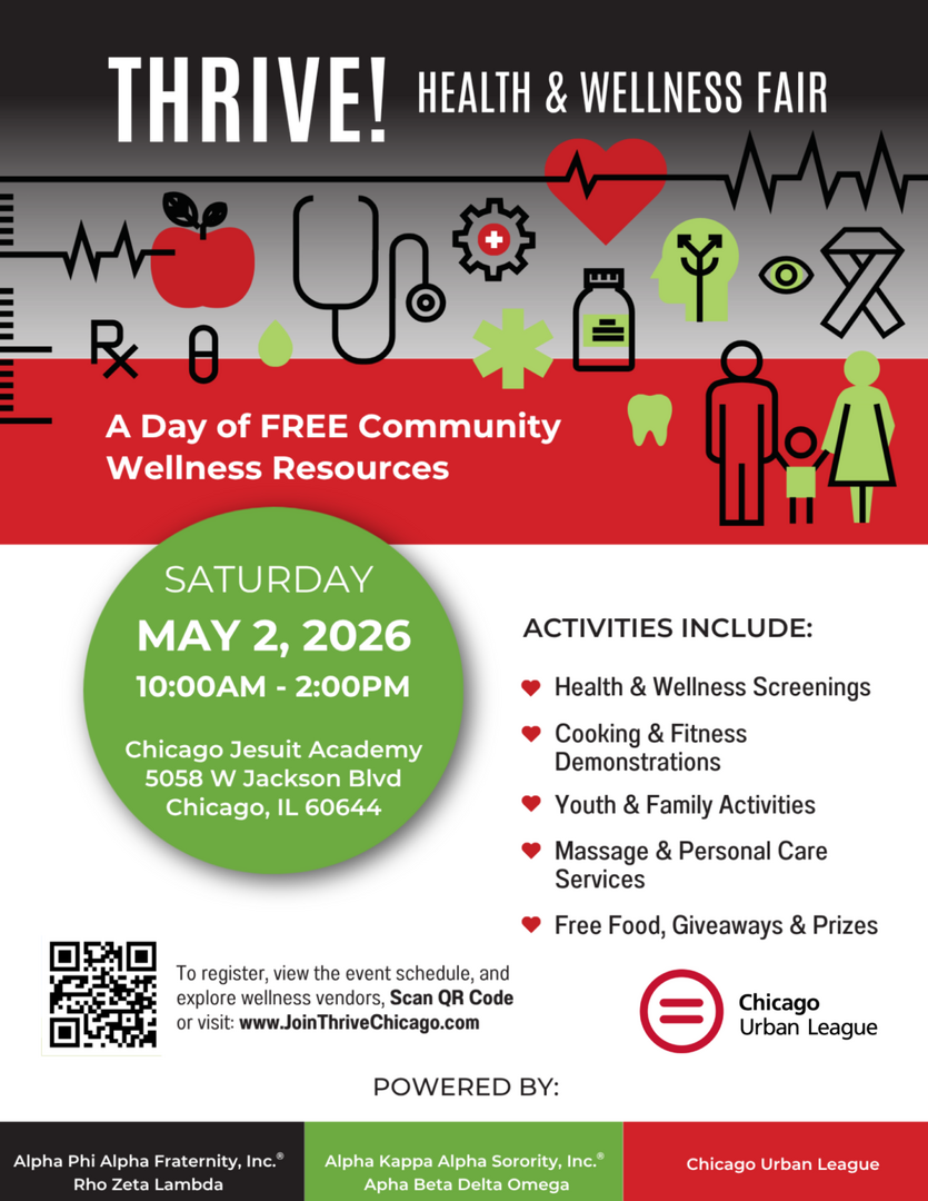 The Chicago Urban League is partnering with Alpha Kappa Alpha Sorority, Inc.® – Alpha Beta Delta Omega Chapter and Alpha Phi Alpha Fraternity, Inc.® – Rho Zeta Lambda Chapter to host the THRIVE! Health & Wellness Fair on Saturday, May 2, from 10 a.m. – 2 p.m. at the Chicago Jesuit Academy.