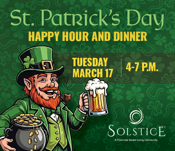 You’re invited to Solstice at Palatine for our St. Patrick’s Day Happy Hour and Dinner. Enjoy good company, cheerful Irish-inspired décor and a festive dinner as we celebrate the luck of the Irish together. RSVP today at SolsticeSeniorLivingPalatine.com/signature-event. We look forward to welcoming you!