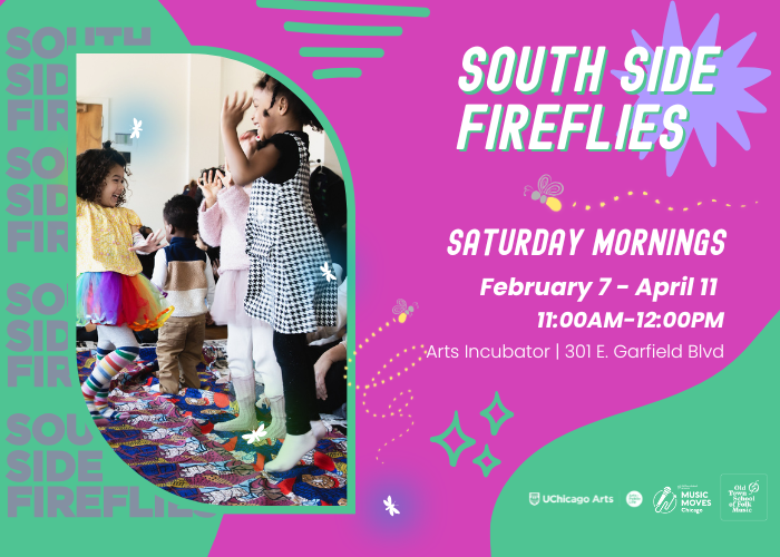South Side Fireflies is a free early childhood music program that introduces toddlers and preschoolers to sound and play through the Earth, Wind & Fire songbook. Led by teaching artists Shanta Nurullah, Zahra Baker, Angel Bat Dawid and Julian Otis, Fireflies is a place for families to gather on Saturday mornings for music and fun on the Arts Block.