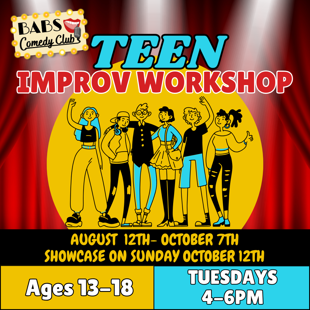 Calling all teens! Unleash your creativity, boost confidence, and learn to think on your feet! This 10-week improv course, taught by professional performers with decades of experience, ends with a live showcase on the BABS Comedy Club stage. No experience needed—just bring your imagination. Weekly class schedule as follows: