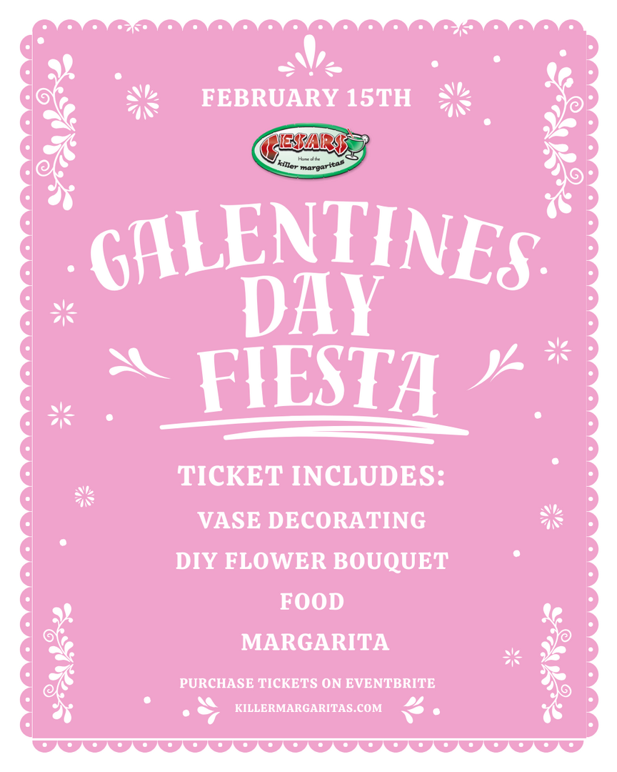On Sunday, February 15th, Cesar’s invites to you join for their Galentine’s Day Fiesta, from 1:00pm - 5:00pm. Celebrate friendship in style with vase decorating, DIY flower bouquet, food and margaritas. So whether you're planning a cozy gathering or a lively party, it's the perfect occasion to honor your closest friends.