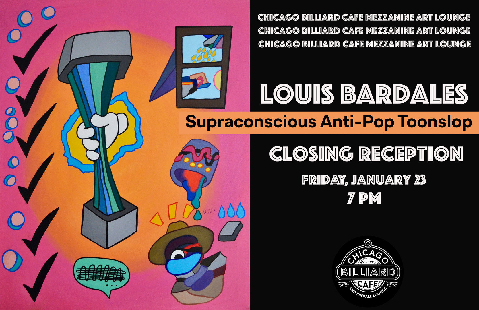This closing marks the final opportunity to experience the full body of work at The Chicago Billiard Cafe! Join us on January 23rd at 7pm.