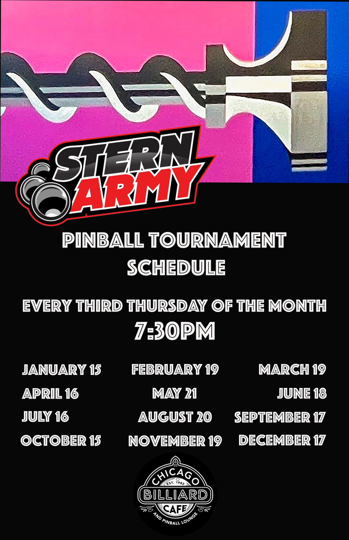 HomeEventsStern Army Pinball Tournament Stern Army Pinball Tournament Thursday, January 15, 2026 7:30 PM - 10:00 PM 7:30 PM - 10:00 PM See all dates and Times Chicago Billiard Cafe (and pinball lounge) Parking Deals Get a Ride LYFT UBER Add to Calendar 01/15/2026 07:30 PM 01/15/2026 10:00 PM America/Bahia_Banderas Stern Army Pinball Tournament 7:30 Pm register ALl skill levels welcomeEvent LinksWebsite: https://go.evvnt.com/3401164-0 Details & Tickets: https://www.upcomingevents.com/chicago/events/chicago-billiard-cafe-and-pinball-lounge/stern-army-pinball-tournament-578445?ref=uceaddevent Chicago Billiard Cafe (and pinball lounge), 5935 West Irving Park Road, Chicago, IL, 60634 Set Reminder Categories Fitness-Oriented, Health & Wellness, Outdoor Event, Outdoors & Recreation, Sports Neighborhoods Belmont Central (Chicago)Dunning (Chicago)Jefferson Park (Chicago)Portage Park (Chicago) View Event Website » 7:30 Pm register ALl skill levels welcomeEvent LinksWebsite: https://go.evvnt.com/3401164-0
