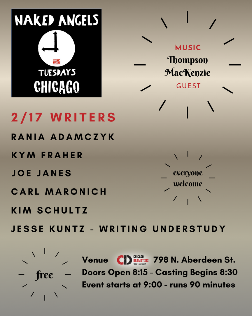 Actors: Show up between 8:15-8:30 to be considered for casting. Casting takes place between 8:30-9:00. Event begins at 9:00 sharp. Naked Angels Tuesdays@9 Chicago is part of the longest-running cold reading series in the United States. It is free and open to the public. We meet at Chicago Dramatists every Tuesday. Invite everyone! Friendly environment!