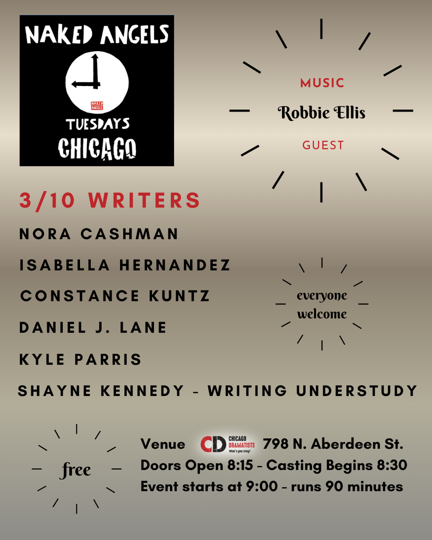 Actors: Show up between 8:15-8:30 to be considered for casting. Casting takes place between 8:30-9:00. Event begins at 9:00 sharp. Naked Angels Tuesdays@9 Chicago is part of the longest-running cold reading series in the United States. It is free and open to the public. We meet at Chicago Dramatists every Tuesday. Invite everyone! Friendly environment!
