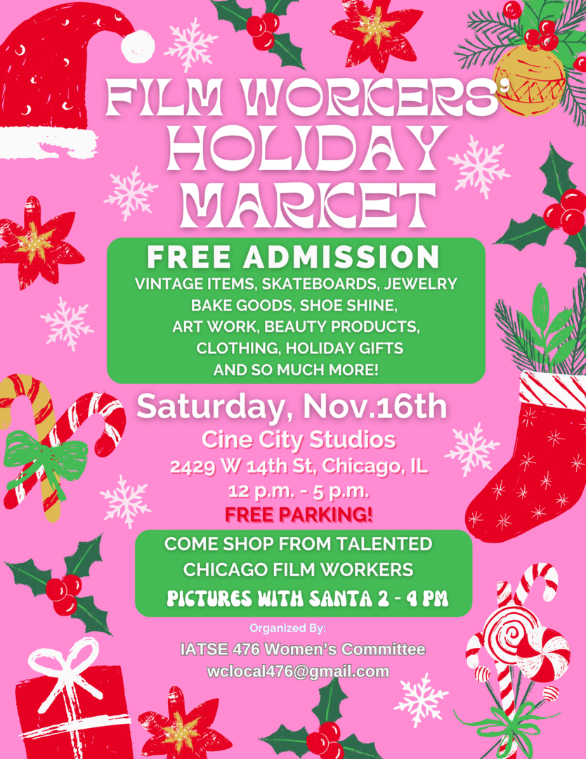 Check out the 2nd Film Worker's Holiday Market Nov. 16th at Cine City Studios. This market is a mix of an Arts and Crafts Fair, plus a Vintage Sale. All the vendors work behind the scenes in the Chicago Film Industry! They are selling artwork, handmade beauty products, bake goods, vintage items, Christmas decor and so much more! Plus music, food, and a visit from Santa! Free admission and free parking! 12-5pm!