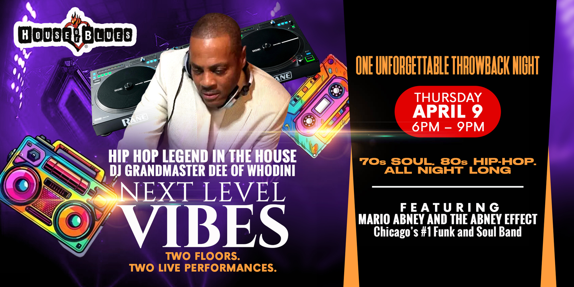 One floor brings hip-hop, R&B, Pop, Reggae, and other classics to life such as the legendary tracks Freaks Come Out at Night, Funky Beat, and Friends with DJ Grandmaster Dee of Whodini. Another floor sets the mood with Mario Abney and the Abney Effect (as featured on Good Morning America), a five-piece Chicago band blending soul, jazz, and brass into a sound that keeps the party moving.