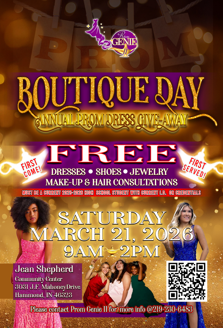 Students will be serviced on a first come, first served basis. A current year school I.D., or proof of enrollment on school letterhead is required. One person is allowed to accompany each student. No children are allowed. Please pre-register at www.promgenie2.org/event-details-registration/boutique-day. This will assist us with planning an unforgettable day.