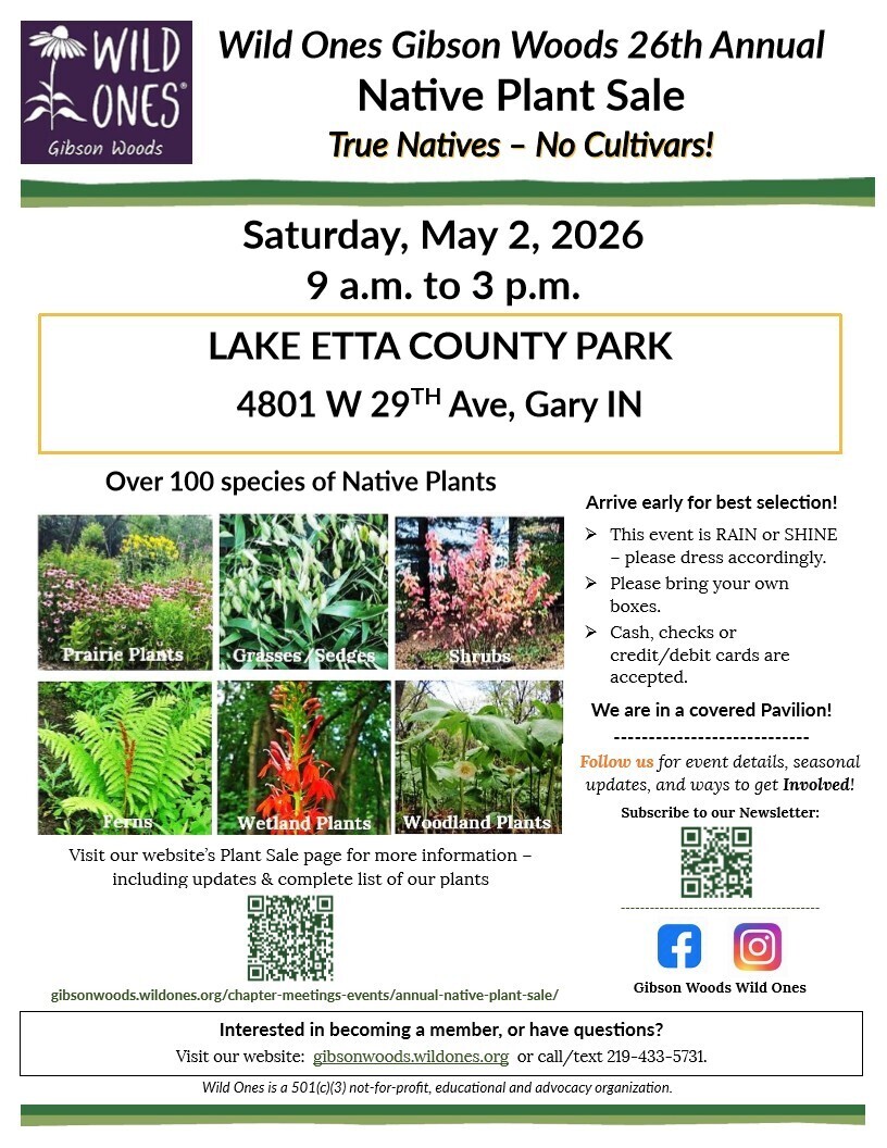 The Gibson Woods chapter of Wild Ones announced that their 26th Annual Native Plant Sale will be held on Saturday, May 2nd from 9 a.m. to 3 p.m. CT. The event will take place inside the large pavilion at beautiful Lake Etta County Park, located at 4801 W 29th Ave, Gary, IN 46406 – just 3 blocks south & 3 blocks east of the I 80/94 Burr Street exit.