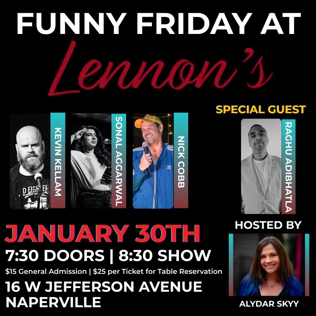 HomeEventsFunny Friday at Lennon's: a standup comedy showcase Funny Friday at Lennon's: a standup comedy showcase Friday, January 30, 2026 8:30 PM - 10:30 PM 8:30 PM - 10:30 PM See all dates and Times Lennon's Parking Deals Get a Ride LYFT UBER Add to Calendar 01/30/2026 08:30 PM 01/30/2026 10:30 PM America/Bahia_Banderas Funny Friday at Lennon's: a standup comedy showcase Twice a month, Funny Fridays brings the best comedians in the area to Lennon's. You're gonna want to be there.Event LinksTickets: https://go.evvnt.com/3434822-0 Details & Tickets: https://www.upcomingevents.com/chicago/events/lennons/funny-friday-at-lennons-a-standup-comedy-showcase-587342?ref=uceaddevent Lennon's, 16 West Jefferson Avenue, Naperville, IL, 60540 Set Reminder Categories Comedy, Comedy Show, Live Entertainment, Performing Arts Neighborhoods Big Woods-Marmion (Aurora)Georgetown (Aurora)Southeast Aurora (Aurora)Big Woods-Marmion (Aurora) Twice a month, Funny Fridays brings the best comedians in the area to Lennon's. You're gonna want to be there.Event LinksTickets: https://go.evvnt.com/3434822-0 Read More View Less