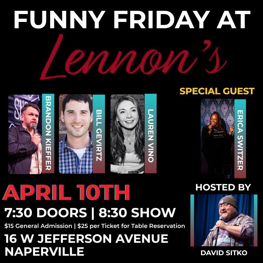 HomeEventsFunny Fridays at Lennons: Naperville's best stand-up Funny Fridays at Lennons: Naperville's best stand-up Friday, April 10, 2026 8:30 PM - 10:30 PM 8:30 PM - 10:30 PM See all dates and Times Lennon's Parking Deals Get a Ride LYFT UBER Add to Calendar 04/10/2026 08:30 PM 04/10/2026 10:30 PM America/Atikokan Funny Fridays at Lennons: Naperville's best stand-up Amazing stand-up from all over the midwest. Make sure you are at Lennon's for the second and fourth Friday of the month.Event LinksTickets: https://go.evvnt.com/3561278-0 Details & Tickets: https://www.upcomingevents.com/chicago/events/lennons/funny-fridays-at-lennons-napervilles-best-stand-up-630380?ref=uceaddevent Lennon's, 16 West Jefferson Avenue, Naperville, IL, 60540 Set Reminder Categories Comedy, Comedy Show, Live Entertainment, Performing Arts Amazing stand-up from all over the midwest. Make sure you are at Lennon's for the second and fourth Friday of the month.Event LinksTickets: https://go.evvnt.com/3561278-0 Read More View Less