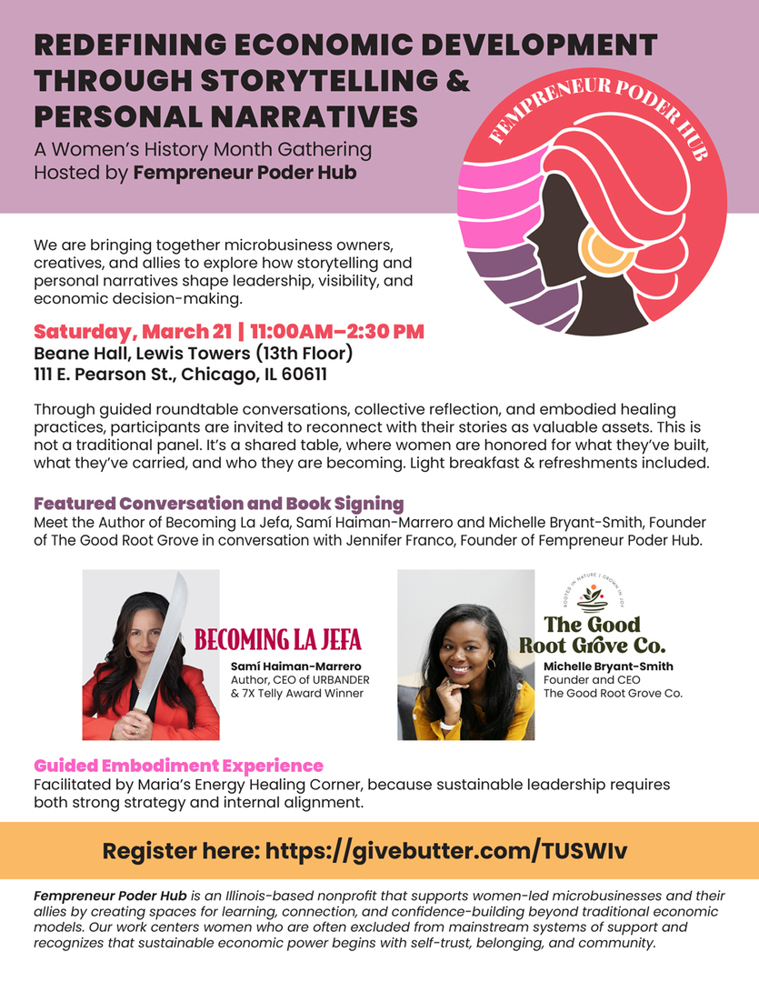 Meet the Author of Becoming La Jefa, Samí Haiman-Marrero and Michelle Bryant-Smith, Founder of The Good Root Grove in conversation with Jennifer Franco, Founder of Fempreneur Poder Hub.
