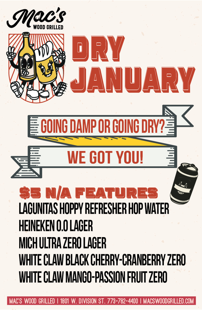 Mac’s Wood Grilled features a lineup of non-alcoholic (NA) specials for Dry January. The no-alc beer lineup lists Lagunitas Brewing Hoppy Refresher, a crisp, sparkling beverage that’s chock-full of Citra, Equinox, and Centennial hops; Heineken 0.0, a no-alc malt lager that’s double brewed with the same ingredients used for Heineken Original (water, barley malt, hop extracts, and Heineken® A-Yeast); and Michelob Ultra Zero, an alcohol-free brew with a crisp citrus aroma and a clean finish. The NA options also include zero-proof seltzers: White Claw Black Cherry Cranberry Zero (natural ripe black cherry flavor and a hint of tart cranberry), and Mango Passion Fruit Zero (mango and tropical passion fruit flavors). The booze-free options are featured through January 31.