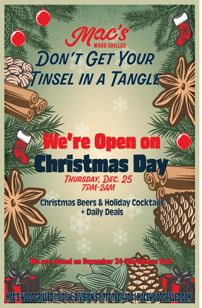 Stop by Mac’s Wood Grilled after the holiday feast for Christmas cheer! Enjoy a selection of holiday beers and cocktails such as 3 Floyds Alpha Klaus ($7/16-ounce draft) and a Holiday Peppermint Shot with Mozart Chocolate Cream Liqueur and Rumple Mintz ($9). The regular daily deals are also on offer with options such as $5 house vodka cocktails, $5 Screwball Peanut Butter Whiskey shots, and $4 Paddy Irish Whiskey shots. The bar is open from 7 p.m.-2 a.m. on Thursday, December 25. Mac’s is closed on Wednesday, December 24 (Christmas Eve).