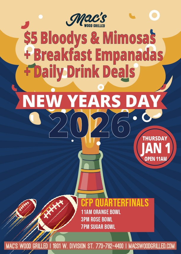 The Wicker Park sports bar celebrates the first day of 2026 with college bowl games and holiday specials. Look for food features such as Breakfast Empanadas, featuring two empanadas stuffed with egg, bacon, cheese sauce, cheddar jack cheese and potatoes, and served with a side of housemade salsa verde ($9). All-day drink deals include $5 Bloody Marys and $5 Mimosas, plus an array of selections such as $4 Paddy Irish Whiskey shots, $5 Skrewball Peanut Butter Whiskey shots, $4 Pink Whitney Vodka shots, and $5 house vodka cocktails (excludes Red Bull).