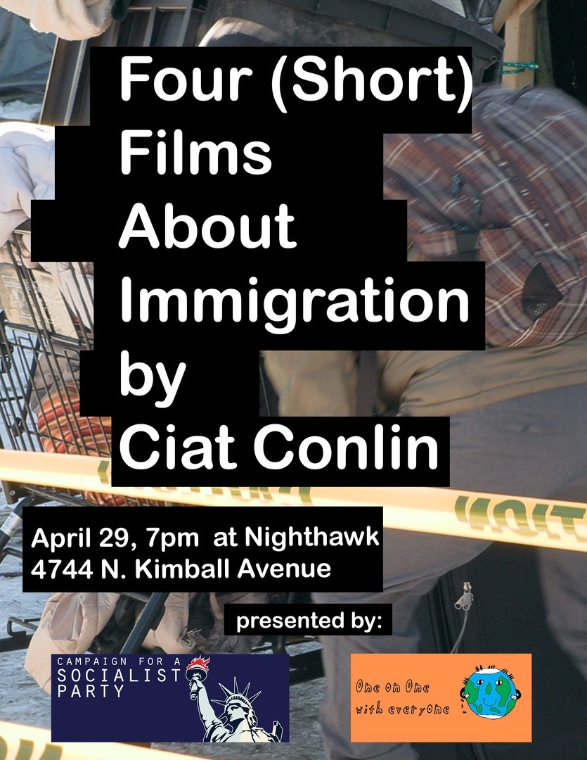 HomeEvents4 Short Films About Immigration by Ciat Conlin 4 Short Films About Immigration by Ciat Conlin Wednesday, April 29, 2026 7:30 PM - 9:00 PM 7:30 PM - 9:00 PM See all dates and Times Nighthawk Parking Deals Get a Ride LYFT UBER Add to Calendar 04/29/2026 07:30 PM 04/29/2026 09:00 PM America/Atikokan 4 Short Films About Immigration by Ciat Conlin A screening and discussion of four short documentaries by Chicago filmmaker Ciat Conlin, focusing on immigration stories from Chicago to the Polish-Belarusian border. Details & Tickets: https://www.upcomingevents.com/chicago/events/nighthawk/4-short-films-about-immigration-by-ciat-conlin-639289?ref=uceaddevent Nighthawk, 4744 North Kimball Avenue, Chicago, IL, 60625 Set Reminder Categories Arts Oriented, Film, Performing Arts A screening and discussion of four short documentaries by Chicago filmmaker Ciat Conlin, focusing on immigration stories from Chicago to the Polish-Belarusian border.